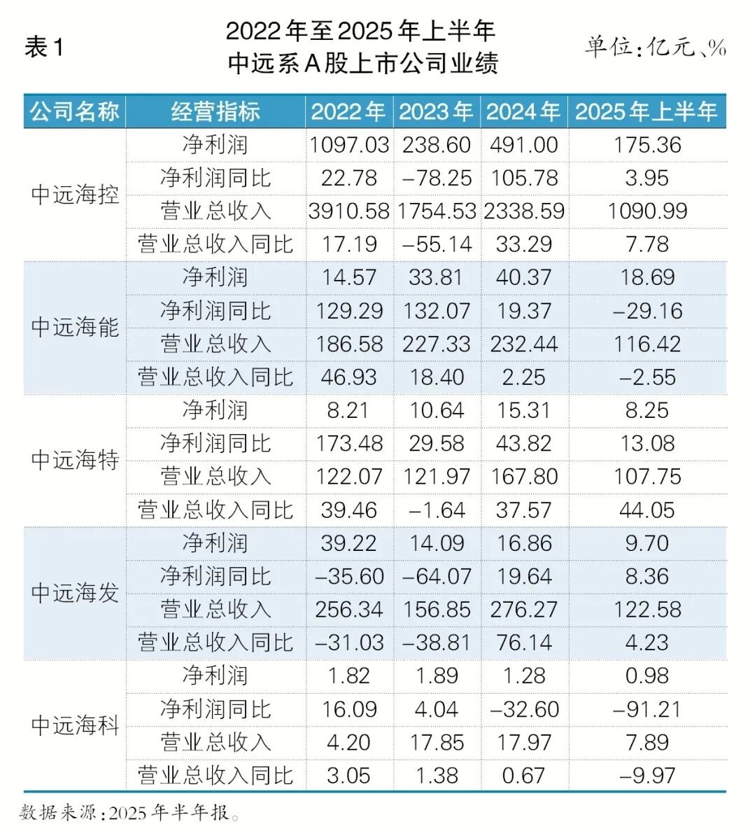 2025 年上半年,中远系五家A股上市公司先后发布半年报(见表1)。