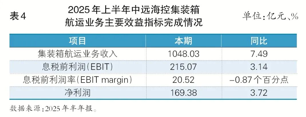 相干词,仔细看收益主义,货量与收入的高增未能同步更始为利润。中远海控集装箱航运的息税前利润率(EBIT margin)由 21.39%降至20.52%,同比减少0.87个百分点;净利润169.38亿元,增幅3.72%,利润增速彰着落伍于收入增速,增收不增利的警报照旧拉响。业内东说念主士以为,2025 年上半年骨干航路竞争加重、资本传导不畅,集运板块在“量增价稳”的表象下已骨子进入“利润保卫战”阶段(见表4)。