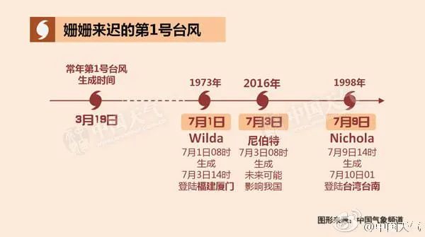 我国有景观记录以来,1号台风生成最晚记录为1998年7月9日生成的“妮蔻儿”;其次则是2016年7月3日生成的“尼伯特”。